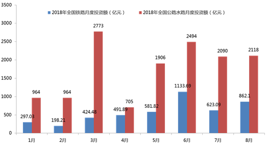 圖1 2018年全國(guó)公路水路及鐵路月度投資額