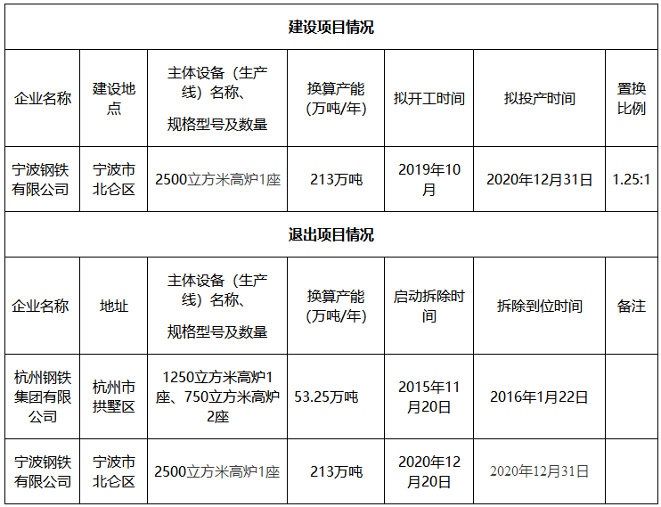 備注:杭州鋼鐵集團(tuán)公司1250立方米高爐1座、750立方米高爐2座已于2016年完成淘汰,共計(jì)煉鐵產(chǎn)能300萬(wàn)噸(其中,110萬(wàn)噸為明確壓減的煉鐵產(chǎn)能,190萬(wàn)噸為符合產(chǎn)能置換條件的煉鐵產(chǎn)能,符合產(chǎn)能置換的煉鐵產(chǎn)能中53.25萬(wàn)能噸已在寧鋼一號(hào)高爐大修改造已用,剩136.75萬(wàn)噸鐵產(chǎn)能),本次產(chǎn)能置換方案使用其中符合產(chǎn)能置換條件煉鐵產(chǎn)能中的53.25萬(wàn)噸,剩余83.5萬(wàn)噸留作今后置換用。