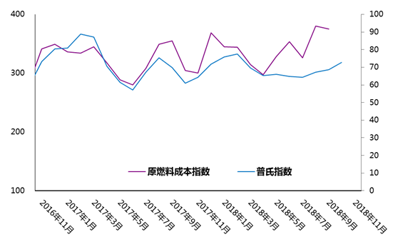 據(jù)蘭格鋼鐵云商平臺監(jiān)測數(shù)據(jù)顯示,2018年10月份國產(chǎn)鐵精礦745.66元/噸,比9月份上漲0.33元/噸。2018年10月份國產(chǎn)焦炭2443.75元/噸,比9月份上漲93.75元/噸。據(jù)海關數(shù)據(jù)顯示,2018年9月份進口礦均價70.49美元/噸,比8月份上漲2.89美元/噸。2018年10月份普氏62%鐵礦石指數(shù)為72.69,比9月份上升3.96(詳見圖3)。鐵礦石價格近期出現(xiàn)了上漲跡象,11月份,鐵礦石價格將維持小幅上漲走勢。