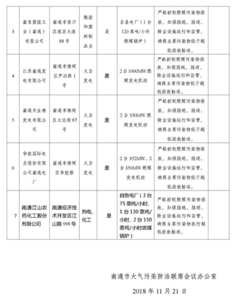 11月22日,江蘇南通市大氣污染防治聯(lián)席會議辦公室對2018-2019年秋冬季錯峰生產(chǎn)及重污染天氣應(yīng)急管控停限產(chǎn)的豁免企業(yè)名單進行公示。