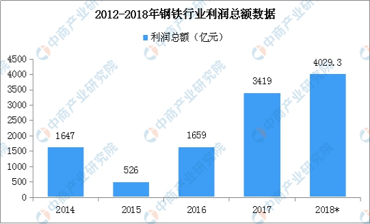 在行業(yè)利潤總額方面,2015年以來,鋼鐵行業(yè)利潤總額呈現增長態(tài)勢。據國家統(tǒng)計局初步統(tǒng)計數據顯示,2018年全年鋼鐵行業(yè)實現利潤總額達到4029.3億元。