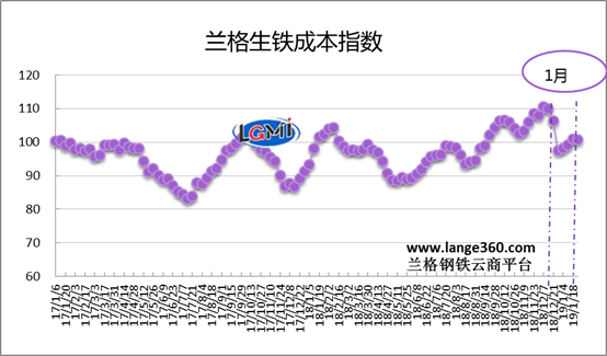 從圖1蘭格生鐵成本指數(shù)走勢(shì)圖可以看出,2019年1月份的生鐵成本指數(shù)呈低位回升走勢(shì),由月初的98.1點(diǎn)震蕩升至月末的100.7點(diǎn),均值較上月下降6.4%。
