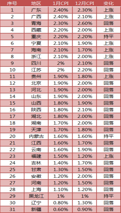 此外,國家統(tǒng)計局近日還公布了全國31個省市1月居民消費價格指數(shù)?!?/span>