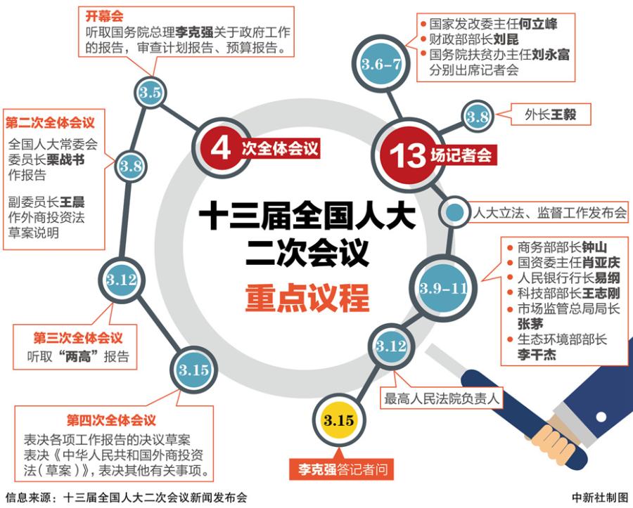 根據(jù)已經(jīng)公布的日程,十三屆全國人大二次會議今日上午9時(shí)在人民大會堂開幕,今日議程包括: