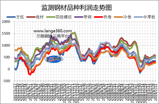 圖2是蘭格鋼鐵云商平臺(tái)監(jiān)測(cè)的各主要鋼材品種的盈利能力曲線對(duì)比。從圖2可以看出, 2月份7大品種測(cè)算毛利呈小幅回升態(tài)勢(shì),2月各品種平均毛利較上月上升50 -89元/噸;其中中厚板毛利上升最多,為89元/噸;高線毛利上升最少,為50元/噸;其他品種盈利上升幅度在51-78元/噸之間。