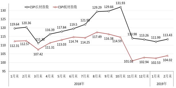 2月末,CSPI長(zhǎng)材指數(shù)為113.43點(diǎn),環(huán)比上升1.44點(diǎn),升幅為1.29%;CSPI板材指數(shù)為104.02點(diǎn),環(huán)比上升1.49點(diǎn),升幅為1.45%,比長(zhǎng)材價(jià)格升幅高0.16個(gè)百分點(diǎn);與去年同期相比,長(zhǎng)材價(jià)格指數(shù)下降6.93點(diǎn),降幅為5.76%;板材價(jià)格指數(shù)下降8.55點(diǎn),降幅為7.60%。(見下圖、表)