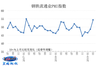蘭格鋼鐵云商平臺統(tǒng)計發(fā)布的2019年3月份鋼鐵流通業(yè)PMI總指數(shù)為54.5,環(huán)比上升5.8個百分點。綜合來看,三月份鋼鐵流通企業(yè)銷量明顯回升,去庫順暢,市場心態(tài)謹慎樂觀,采購意愿增強,預計四月份鋼鐵行業(yè)需求較好的局面仍會延續(xù)。
