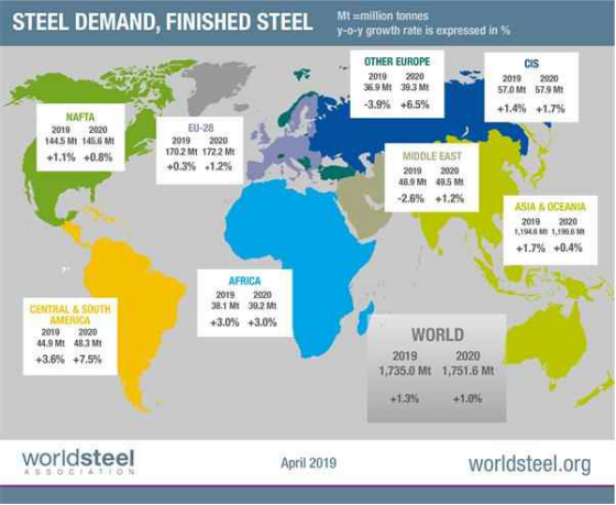 核心提示:全球鋼鐵需求在經(jīng)濟增速放緩的大背景下繼續(xù)增長 世界鋼鐵協(xié)會近日發(fā)布了2019年4月版短期鋼鐵需求預(yù)測結(jié)果。據(jù)預(yù)測,2019年全球鋼