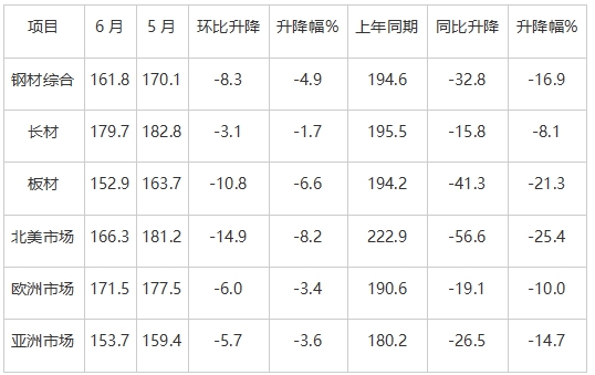 6月,CRU長(zhǎng)材指數(shù)為179.7點(diǎn),環(huán)比下降3.1點(diǎn),降幅1.7%,較上月收窄1.0個(gè)百分點(diǎn);CRU板材指數(shù)為152.9點(diǎn),環(huán)比下降10.8點(diǎn),降幅為6.6%,較上月加大3.8個(gè)百分點(diǎn),比長(zhǎng)材價(jià)格降幅大4.9個(gè)百分點(diǎn);與上年同期相比,CRU長(zhǎng)材指數(shù)下降15.8點(diǎn),降幅為8.1%;CRU板材指數(shù)下降41.3點(diǎn),降幅為21.3%。