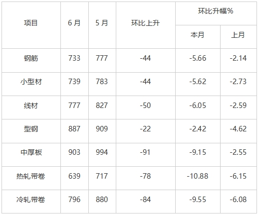6月末,鋼鐵協(xié)會(huì)監(jiān)測(cè)的八大鋼材品種中,角鋼價(jià)格由降轉(zhuǎn)升,環(huán)比上升21元/噸。其他品種價(jià)格均繼續(xù)下降,其中:線材、鋼筋和冷軋薄板價(jià)格降幅收窄,環(huán)比分別下降22元/噸、67元/噸和82元/噸;中厚板、熱軋卷板、鍍鋅板和熱軋無(wú)縫管價(jià)格降幅加大,環(huán)比分別下降84元/噸、84元/噸、48元/噸和93元/噸。(見(jiàn)下表)