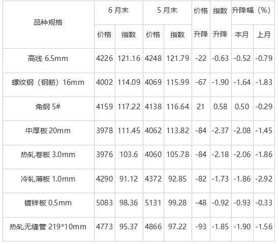 從全月情況看,6月份CSPI中國(guó)鋼材價(jià)格指數(shù)平均值為108.99點(diǎn),比5月份平均值下降2.94點(diǎn),降幅為2.62%。