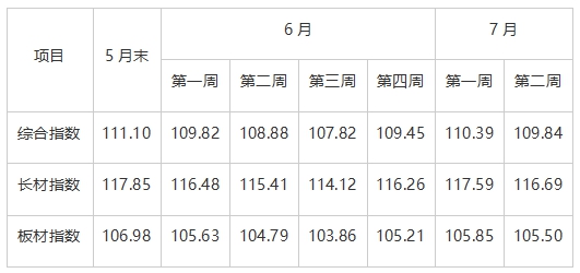 6月末,CSPI長(zhǎng)材指數(shù)為116.26點(diǎn),環(huán)比下降1.59點(diǎn),降幅為1.35%;CSPI板材指數(shù)為105.21點(diǎn),環(huán)比下降1.77點(diǎn),降幅為1.65%,比長(zhǎng)材價(jià)格降幅大0.30個(gè)百分點(diǎn);與去年同期相比,長(zhǎng)材價(jià)格指數(shù)下降3.24點(diǎn),降幅為2.71%;板材價(jià)格指數(shù)下降9.53點(diǎn),降幅為8.31%。(見(jiàn)下圖、表)