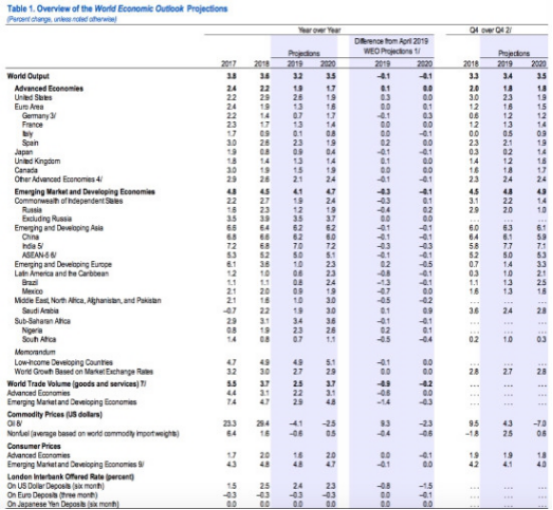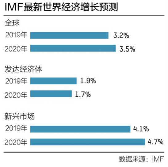 國(guó)際貨幣基金組織(IMF)7月23日發(fā)布的最新《世界經(jīng)濟(jì)展望報(bào)告》(WEO)中,再次調(diào)降了對(duì)2019年和2020年世界經(jīng)濟(jì)增長(zhǎng)的預(yù)期,預(yù)計(jì)2019年全球經(jīng)濟(jì)增長(zhǎng)3.2%,2020年回升至3.5%,比4月WEO對(duì)今明兩年的預(yù)測(cè)再均下調(diào)0.1個(gè)百分點(diǎn)。