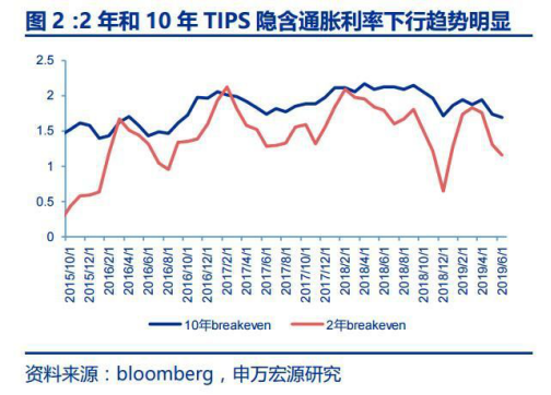 聯(lián)儲重點(diǎn)關(guān)注低通脹風(fēng)險(xiǎn),目前核心PCE(該數(shù)據(jù)出自美國,是衡量美國民間消費(fèi)通脹的關(guān)鍵指標(biāo))從2018年中到達(dá)2%之后持續(xù)下跌至1.6%,且市場對于未來通脹預(yù)期仍較悲觀,2年期和10年期TIPS隱含通脹利率以及紐約聯(lián)儲對于1年期和3年通脹預(yù)期中值顯示出短期至長期的通脹下行趨勢明顯。