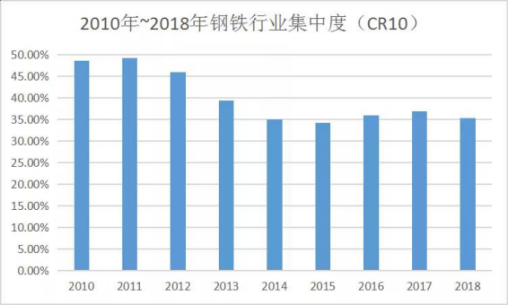 多年來,為促進(jìn)企業(yè)兼并重組,國家先后出臺了多個文件,但是執(zhí)行效果并不理想。《鋼鐵工業(yè)“十二五”發(fā)展規(guī)劃》明確提出,2015年,國內(nèi)排名前10位的鋼鐵企業(yè)集團(tuán)鋼產(chǎn)量占全國總量的比例(CR10)要提高到60%左右。但是,鋼鐵行業(yè)CR10從2010年的48.6%,逐年下滑至2015年的34.2%。2016年中國寶武鋼鐵集團(tuán)的成立,使CR10回升至35.9%;2018年,CR10又下降至35.3%。