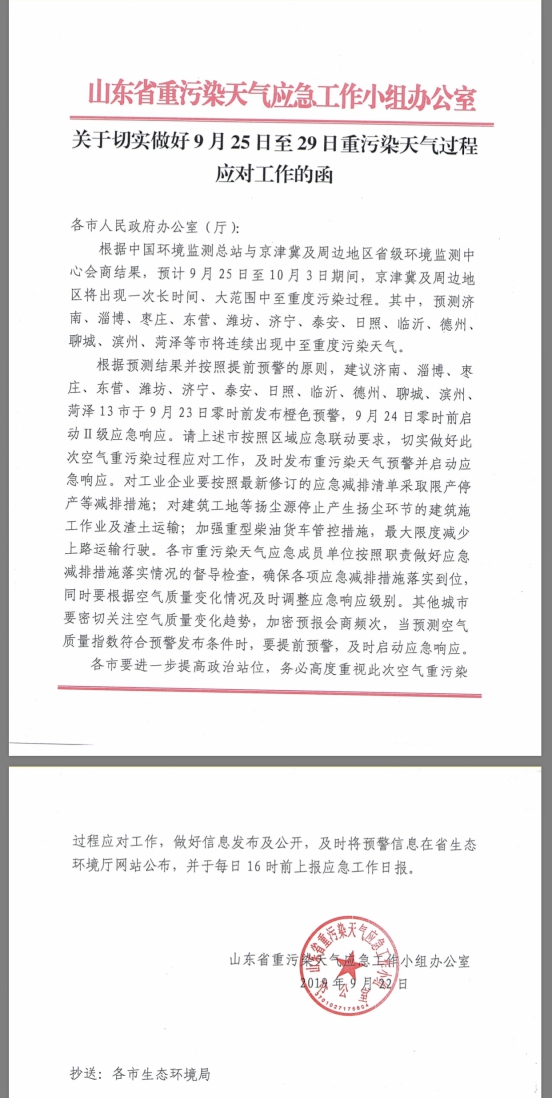 為有效應(yīng)對重污染天氣,山東省重污染天氣應(yīng)急工作小組辦公室下發(fā)《關(guān)于切實(shí)做好9月25日至29日重污染天氣過程應(yīng)對工作的函》,要求包括濟(jì)南在內(nèi)的山東省13個地市發(fā)布橙色預(yù)警并啟動Ⅱ級應(yīng)急響應(yīng)。按照生態(tài)環(huán)境部及省生態(tài)環(huán)境廳要求,根據(jù)《濟(jì)南市重污染天氣應(yīng)急預(yù)案》有關(guān)規(guī)定,濟(jì)南市于9月23日零時發(fā)布重污染天氣橙色預(yù)警,并于9月24日零時啟動Ⅱ級應(yīng)急響應(yīng)。預(yù)警期間采取的應(yīng)急響應(yīng)措施: