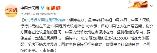 9月24日,中國(guó)人民銀行行長(zhǎng)易綱在回應(yīng)“中國(guó)是否會(huì)跟進(jìn)降息”時(shí)表示,目前中國(guó)經(jīng)濟(jì)在合理區(qū)間,物價(jià)方面也在比較溫和的區(qū)間,中國(guó)的貨幣政策應(yīng)當(dāng)保持定力,堅(jiān)持穩(wěn)健的取向,要穩(wěn)當(dāng)前,加強(qiáng)逆周期調(diào)節(jié),保持M2、社會(huì)融資規(guī)模增速和名義GDP增速大體匹配,堅(jiān)決不搞大水漫灌,同時(shí)注意保持杠桿率穩(wěn)定,使得整個(gè)社會(huì)債務(wù)在一個(gè)可持續(xù)水平。