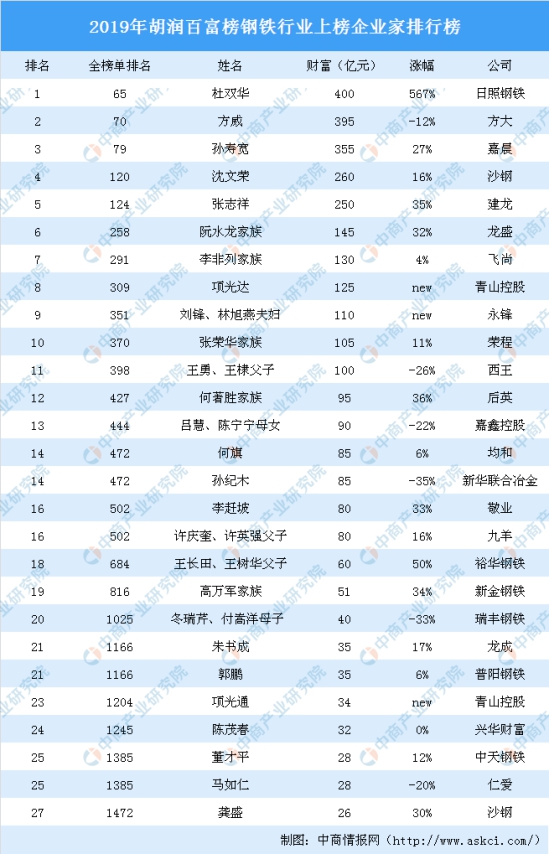10月10日,胡潤(rùn)研究院發(fā)布了《2019胡潤(rùn)百富榜》,榜單顯示,27名鋼鐵行業(yè)企業(yè)家上榜,其中,日照鋼鐵杜雙華財(cái)富最多,共計(jì)400億元。方大方威、嘉晨孫壽寬排名第二和第三,財(cái)富分別為395億元、355億元。財(cái)富超百億的企業(yè)家還有:沙鋼沈文榮、建龍張志祥、龍盛阮水龍家族、飛尚李非列家族、青山控股項(xiàng)光達(dá)、永鋒劉鋒、林旭燕夫婦、榮程張榮華家族、西王王勇、王棣父子。