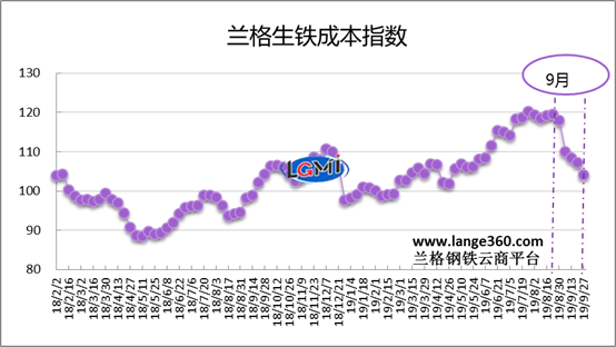 從圖1蘭格生鐵成本指數(shù)走勢(shì)圖可以看出,2019年9月份的生鐵成本指數(shù)呈震蕩下行走勢(shì),由月初的110.0點(diǎn)降至月末的104.0點(diǎn),均值較上月下降9.7%。
