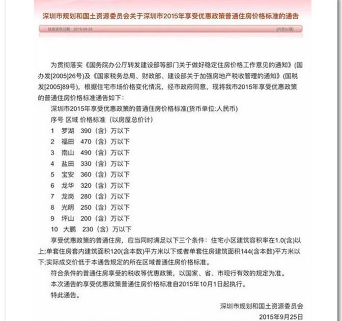 在此之前,深圳一直用2015年10月1日開始執(zhí)行的《享受優(yōu)惠政策普通住房價格標(biāo)準》來區(qū)分普通住宅與非普通住宅: