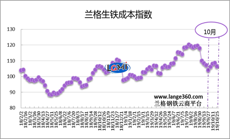 從圖1蘭格生鐵成本指數(shù)走勢圖可以看出,2019年10月份的生鐵成本指數(shù)呈先升后降走勢,由月初的106.2點(diǎn)變化至月末的106.6點(diǎn),均值較上月下降0.2%。