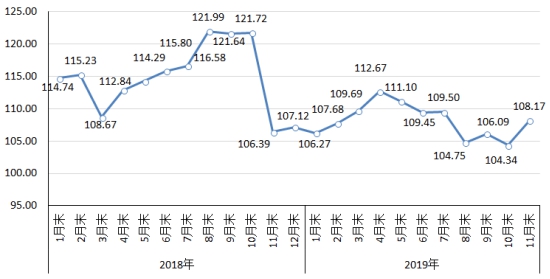11月末,鋼鐵協(xié)會中國鋼材價格指數(shù)(CSPI)為108.17 點,環(huán)比上升3.83點,升幅為3.67%;同比上升1.78點,升幅為1.67%。(見下圖)