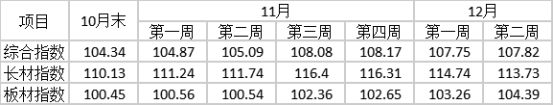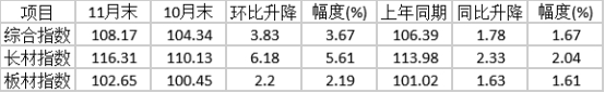 11月末,CSPI長材指數(shù)為116.31點,環(huán)比上升6.18點,升幅為5.61%;CSPI板材指數(shù)為102.65點,環(huán)比上升2.20點,升幅為2.19%;長材價格升幅比板材高3.42個百分點;與去年同期相比,長材價格指數(shù)上升2.33點,升幅為2.04%;板材價格指數(shù)上升1.63點,升幅為1.61%。(見下圖、表)