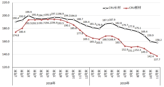 11月,CRU長材指數(shù)為158.2點,環(huán)比下降1.7點,降幅為1.1%;CRU板材指數(shù)為137.7點,環(huán)比下降4.7點,降幅為3.3%,較長材降幅高2.2個百分點;與上年同期相比,CRU長材指數(shù)下降30.5點,降幅為16.2%;CRU板材指數(shù)下降40.1點,降幅為22.6%。(見下圖)