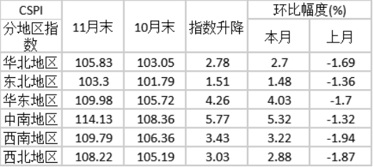 據(jù)鋼鐵協(xié)會監(jiān)測,11月份,CSPI全國六大區(qū)域市場價格指數(shù)均由降轉(zhuǎn)升。其中:中南地區(qū)和華東地區(qū)升幅較大,環(huán)比上升5.32%和4.03%;東北地區(qū)升幅較小,環(huán)比上升1.48%;華北、西南和西北地區(qū)升幅分別為2.70%、3.22%和2.88%。(見下表)