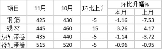 11月末,鋼鐵協(xié)會監(jiān)測的八大鋼材品種價格漲跌互現(xiàn)。其中高線、螺紋鋼和熱軋卷板價格由降轉(zhuǎn)升且升幅較大,環(huán)比分別上升238元/噸、323元/噸和138元/噸;冷軋薄板、中厚板和鍍鋅板價格小幅上升,升幅分別為46元/噸、4元/噸和5元/噸;角鋼、熱軋無縫管價格雖繼續(xù)下降但降幅收窄,環(huán)比分別下降7元/噸和15元/噸。(見下表)