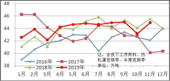 11月份中厚板軋機生產(chǎn)特厚板、中厚板432萬噸,同比增加11萬噸,上升2.6%。熱連軋機生產(chǎn)1347萬噸,同比增加14萬噸,上升1.1%;其中商品量792萬噸,同比增加23萬噸,增長3.0%。供下工序用料555萬噸,同比減少9萬噸,下降1.6%。冷連軋機生產(chǎn)486萬噸,同比增加19萬噸,上升4.0%;其中商品量345萬噸,同比增加13萬噸,上升3.9%。供下工序用料141萬噸,同比增加5萬噸,上升3.9%。中厚板軋機、熱連軋機、冷連軋機日產(chǎn)量變化見圖1-3。