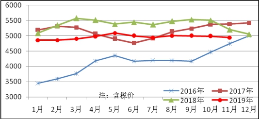11月份生產(chǎn)鍍鋅板149萬噸,同比增加7萬噸,上升4.6%;本月銷售148萬噸,其中出口17萬噸,產(chǎn)銷率99.3%;售價4944元/噸,比上月下跌41元/噸;月末庫存36萬噸,比上月增加1萬噸。鍍鋅板平均價格見圖8。
