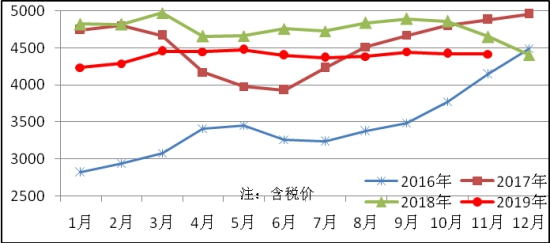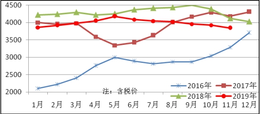 11月份生產(chǎn)中厚板374萬噸,同比增加1萬噸,上升0.2%,銷售400萬噸,其中出口22萬噸,產(chǎn)銷率107.0%;售價4124元/噸,比上月下跌52元/噸;月末庫存150萬噸,比上月減少26萬噸。中厚板平均價格見圖4。