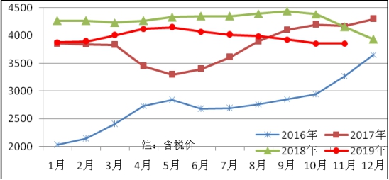 11月份生產(chǎn)中厚寬鋼帶628萬噸,同比增加72萬噸,上升12.9%;銷售629萬噸,其中出口23萬噸,產(chǎn)銷率100.2%;售價3855元/噸,比上月上漲1元/噸;月末庫存105萬噸,比上月減少1萬噸。中厚寬鋼帶平均價格見圖5。