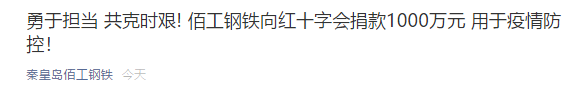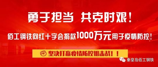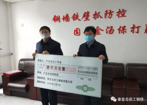 2020年2月6日,秦皇島佰工鋼鐵有限公司向盧龍縣紅十字會捐款1000萬元,用于抗擊新型冠狀病毒肺炎疫情的防治工作。