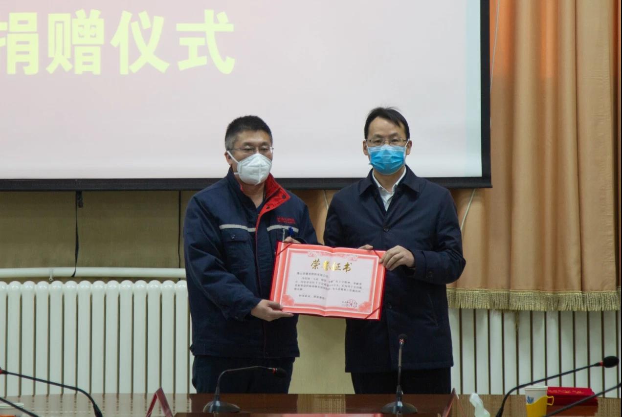 捐贈儀式上,縣委副書記、縣長李軼為唐山德龍頒發(fā)了捐贈證書。