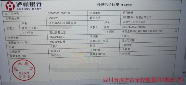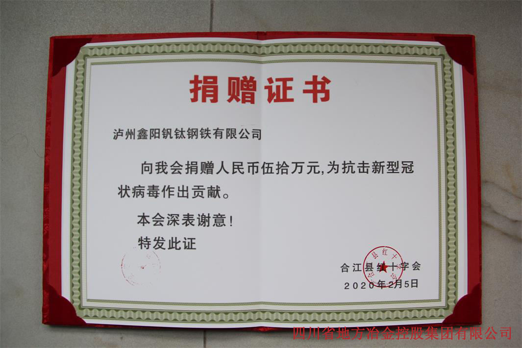 2月5日,為支持抗擊新型冠狀病毒肺炎的疫情防控工作,冶控集團(tuán)瀘州基地瀘州鑫陽釩鈦鋼鐵有限公司分別向合江縣紅十字會(huì)捐款人民幣50萬元,定向用于合江縣新型冠狀病毒感染點(diǎn)肺炎疫情防控或醫(yī)療救護(hù)設(shè)施設(shè)備的購置;向江陽區(qū)紅十字會(huì)捐款人民幣50萬元,用于疫情的防控,共計(jì)捐款100萬元。