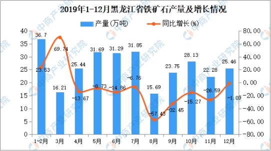 2019年1-12月黑龍江省鐵礦石產(chǎn)量及增長情況