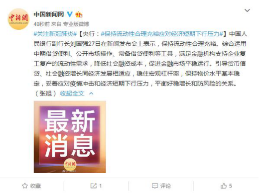 中國(guó)人民銀行副行長(zhǎng)劉國(guó)強(qiáng)27日在新聞發(fā)布會(huì)上表示,保持流動(dòng)性合理充裕。綜合運(yùn)用中期借貸便利、公開(kāi)市場(chǎng)操作、常備借貸便利等工具,滿(mǎn)足金融機(jī)構(gòu)支持企業(yè)復(fù)工復(fù)產(chǎn)的流動(dòng)性需求,降低社會(huì)融資成本,促進(jìn)金融市場(chǎng)平穩(wěn)運(yùn)行。引導(dǎo)貨幣信貸、社會(huì)融資增長(zhǎng)同經(jīng)濟(jì)發(fā)展相適應(yīng),穩(wěn)住宏觀杠桿率,保持物價(jià)水平基本穩(wěn)定,妥善應(yīng)對(duì)疫情沖擊和經(jīng)濟(jì)短期下行壓力,平衡好穩(wěn)增長(zhǎng)和防風(fēng)險(xiǎn)的關(guān)系。