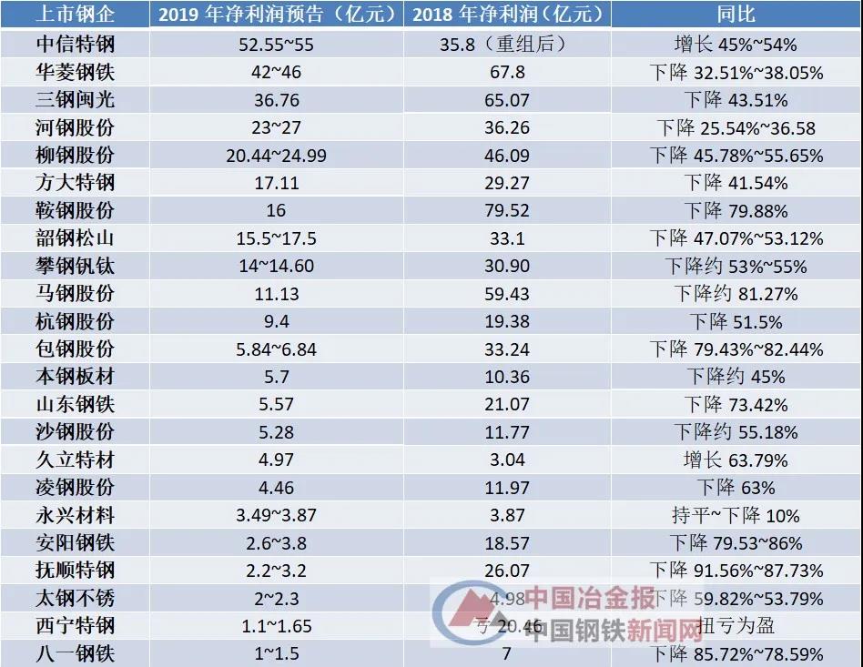 在目前已公布2019年業(yè)績(包括正式公布和預(yù)告)的23家鋼企上市公司中,除中信特鋼、久立特材、西寧特鋼外,大部分企業(yè)表示業(yè)績將出現(xiàn)下滑,最高下滑幅度超過90%。(詳見下表)
