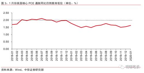 通脹方面,總體來(lái)看美國(guó)核心通脹仍舊表現(xiàn)疲軟。2020年1月美國(guó)核心PCE通脹同比為1.63%,前值1.54%,雖然較上月溫和上升,但是仍然維持在較低水平,仍然未達(dá)到美聯(lián)儲(chǔ)2%的政策目標(biāo)。從收入、投資、消費(fèi)三個(gè)角度綜合考慮,美國(guó)非農(nóng)企業(yè)平均周薪同比增速正處于趨勢(shì)性向下的階段,對(duì)于核心PCE上行的有所拖累;2019年美國(guó)投資增速下行,難以通過(guò)提振總需求的方式拉動(dòng)通脹增長(zhǎng);消費(fèi)數(shù)據(jù)邊際向好,但當(dāng)前的美國(guó)消費(fèi)情況或并不足以支撐通脹水平達(dá)到2%的通脹目標(biāo)??傮w上看,總體來(lái)看美國(guó)核心通脹仍舊表現(xiàn)疲軟。