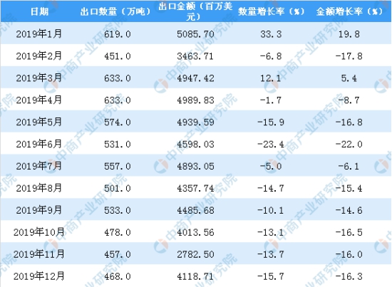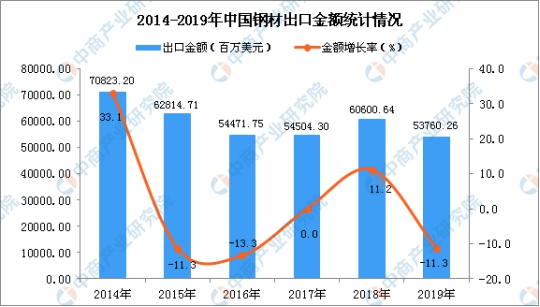 從金額方面來(lái)看,2019年1-12月中國(guó)鋼材出口金額為53760.26百萬(wàn)美元,同比下降11.3%。