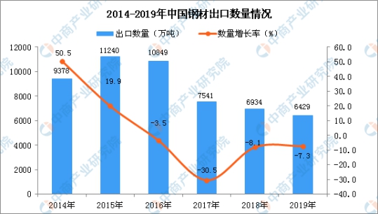 據(jù)中商產(chǎn)業(yè)研究院數(shù)據(jù)庫(kù)顯示,2015-2019年中國(guó)鋼材出口量逐漸下降,2019年1-12月中國(guó)鋼材出口量為6429萬(wàn)噸,同比下降7.3%。