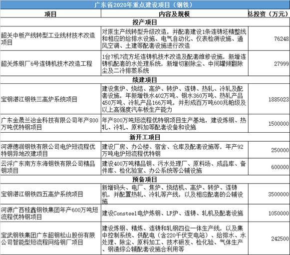 表3  廣東省2020年鋼鐵相關(guān)重點項目