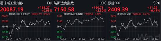 據(jù)Wind數(shù)據(jù),截至當(dāng)?shù)貢r(shí)間3月19日美股收盤,美國(guó)三大股指全線大幅上漲。道指收漲188.27點(diǎn),漲幅0.95%,報(bào)20087.19點(diǎn);納指漲160.73點(diǎn),漲幅2.30%,報(bào)7150.58點(diǎn);標(biāo)普500指數(shù)漲11.29點(diǎn),漲幅0.47%,報(bào)2409.39點(diǎn)。