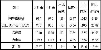 鐵礦石等原燃材料價(jià)格降幅加大,對(duì)鋼價(jià)支撐作用減弱。2月份,鋼鐵生產(chǎn)用原燃材料價(jià)格均繼續(xù)下降,且降幅比1月份有所加大。其中,國產(chǎn)鐵精粉和進(jìn)口鐵礦石價(jià)格環(huán)比分別下降27元/噸和50元/噸,降幅分別為2.77%和5.56%,分別比1月份擴(kuò)大0.76個(gè)和3.39個(gè)百分點(diǎn);煉焦煤和冶金焦價(jià)格環(huán)比分別下降80元/噸和110元/噸,降幅分別為7.34%和8.45%,分別比1月份擴(kuò)大0.11個(gè)和2.87個(gè)百分點(diǎn);廢鋼價(jià)格環(huán)比下降24元/噸,降幅為1.00%。