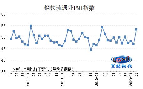 從先行指數(shù)來看,2020年3月份鋼鐵流通業(yè)采購意愿指數(shù)為53.3,較上月上升5.5個百分點,再次進入擴張區(qū)間。走勢判斷指數(shù)為52.7,較上月上升7.4個百分點,表明樣本企業(yè)對后市的預期重回樂觀。