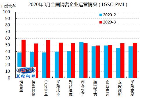 2020年3月份鋼鐵流通企業(yè)銷售量指數(shù)和訂單指數(shù)分別為57.8和57.6,分別較上月回升19.1和18.8個百分點,再度重返擴張區(qū)間,主要是國內(nèi)疫情得到有效控制,市場流通環(huán)節(jié)全面打通,同時,國內(nèi)政策支持全面復工復產(chǎn),下游采購需求也由全面停滯轉(zhuǎn)向正常。