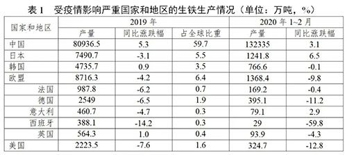 中國(guó)是全球最大的鐵礦石需求國(guó),約占世界鐵礦石消耗量的60%;其次是日本、韓國(guó)、德國(guó)和美國(guó),合計(jì)占12.5%,其他國(guó)家對(duì)鐵礦石市場(chǎng)影響很小。據(jù)世界鋼鐵協(xié)會(huì)統(tǒng)計(jì),2020年1~2月全球共計(jì)產(chǎn)鐵2.2億噸,同比增長(zhǎng)0.78%,其中海外生鐵產(chǎn)量同比降低2.4%。受疫情影響較嚴(yán)重國(guó)家的生鐵生產(chǎn)情況詳見(jiàn)表1。