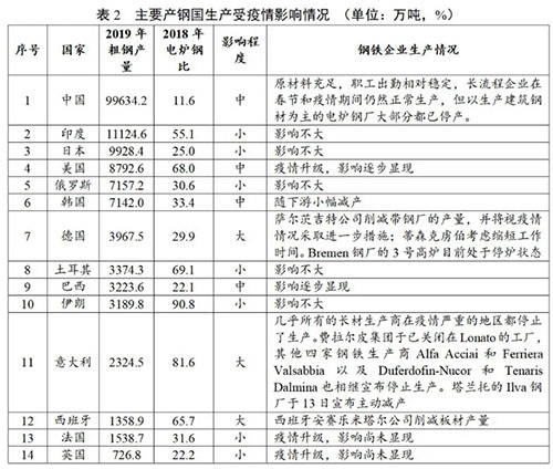 鋼鐵工業(yè)以長(zhǎng)流程為主,全球平均電爐鋼產(chǎn)量占比約30%。在疫情影響下,長(zhǎng)流程需要連續(xù)生產(chǎn),停產(chǎn)的可能性較小,部分企業(yè)可能會(huì)由于原料供應(yīng)不足和下游市場(chǎng)萎縮進(jìn)行一定幅度減產(chǎn)。根據(jù)世界鋼協(xié)數(shù)據(jù),2020年1~2月全球粗鋼產(chǎn)量同比增加1.0%,其中海外粗鋼產(chǎn)量同比減少1.8%,世界主要產(chǎn)鋼國(guó)粗鋼生產(chǎn)受疫情影響見(jiàn)表2。